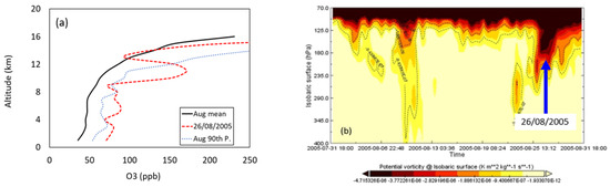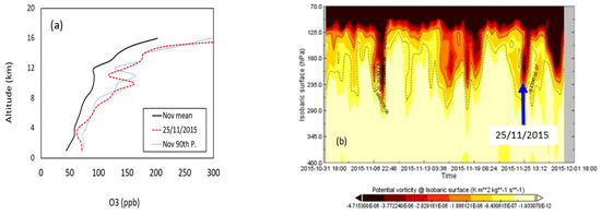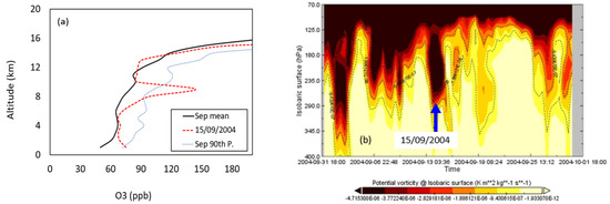 Also, in this study, two high O3 events (15 September 2004 and 25 November 2015) were selected in spring and discussed. It is well known that the spring O3 enhancement events can either be caused by biogenic emissions, biomass burning and lightning production or a combination of them all [11]. However, the occurrence of STEs is dominant in winter and spring over the study area [14], and during this time, the stratospheric polar vortex is more active. According to Clain et al. [47], it is possible that O3 mole fractions related to stratosphere intrusion can be influenced by climatological O3 background.