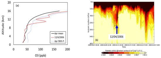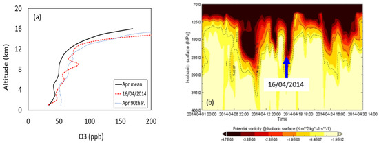 Stratosphere polar vortex forms during autumn in Southern Hemisphere [50]. Moreover, with regards to the geographic position of Irene, this location experiences anticyclonic gyre due to midlatitude westerly waves that occur in autumn and winter [51]. These anticyclonic gyres are responsible for increase in pollutant concentrations for a long period [14]. Two possible stratosphere–troposphere O3 autumn events (12 April 2006 and 16 April 2014) were selected for discussion.