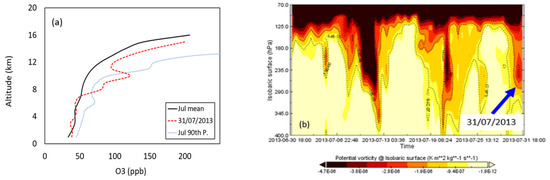 (a) Ozone troposphere profile over Irene on 31 July 2013. (b) Potential vorticity at Isobaric surface over Irene on July 2004 (from MERRA-2). Solid line in Figure 8a indicates monthly O3 average composite, broken line indicates O3 event and dotted line indicate 90th percentile composite. Colours in Figure 8b indicates the level of potential vorticity, black indicates high potential vorticity of more than 3 Km−2 kg−1s−1 while yellow indicates potential vorticity of less than 2 Km−2 kg−1s−1. Blue arrow in Figure 8b indicates the event that is associated with O3 profile in Figure 8a.