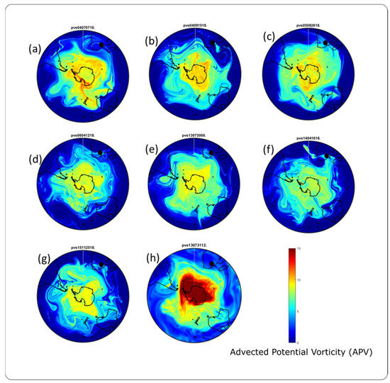 In their recent study, Orte et al. [30] successfully showed the influence of the polar vortex over Rio Gallegos, Argentina by using the APV calculated from the MIMOSA high-resolution advection model. Having adopted a similar approach in this study, the influence of the dynamics of the polar vortex over Irene during the days where the STE was observed is also investigated using the APV outputs from the MIMOSA model. The APV maps assimilated using MIMOSA model for the 350 K isentropic level plotted for the 07 July 2004 (a), 15 September 2004 (b), 26 August 2005 (c), 12 April 2006 (d), 30 July 2013 (e), 31 July 2013, 16 April 2014 (f), and 25 November 2015 (g) are shown in Figure 11. The location of Irene is indicated by a black dot in the maps. The slices of APV for 350 K isentropic level which is equivalent to 12–13 km were selected because this is found to be an appropriate pressure level to investigate an STE event.