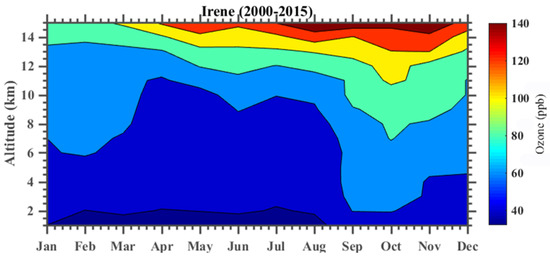 Diab et al. [14] reported a tropopause folding event that occurs during the winter and spring transition period in Irene. The tropopause folding is a good indicator of a STE physical process [14]. Thus, with an improvement of SHADOZ data collection at Irene site since then, it is always important to investigate such a physical process in this study. Figure 12 shows monthly averaged composite of O3 vertical profiles measured at Irene for the year period from 2000 to 2015. These profiles were plotted for the height region ranging from 1 km to 15 km for January (Jan) to December (Dec). There is a general significant intrusion of higher O3 mole fractions which are sourced from the stratosphere which is observed in late winter and spring months. In their study, Diab et al. associated this O3 injection to middle troposphere with westerly winds, which marks the end of maritime season [14]. Also, the subtropical jet was reported to play a role in permitting ozone-rich stratospheric air to penetrate into the troposphere [55]. While most of the free troposphere over Irene was characterised by O3 mole fraction of approximately 55–60 ppb, the late winter months experience an increase of O3 concentration to approximately 80 ppb just above the planetary boundary layer. It is also worth noting that the spring season is the period where there are activities such as anthropogenic pollutants sourced from the Congo region and Highveld region biomass burning, and natural activities such as lightning from rainy season and biogenic activities [56]. On the other hand, a similar observation to that which was reported by Diab et al. [14], the tropical tropopause layer (TTL) with O3 mole fraction ranging between 95 ppb and 100 ppb at a height above 14 km from January to February, while it noticeably declined throughout the year, and approached its minimum altitude of 11 km in October.