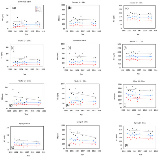 13–15 km layer: with the exception of winter (−0.18 ± 1.34 ppb/year) and spring (−0.50 ± 0.88 ppb/year), a positive change was observed in summer (0.91 ± 1.26ppb/year) and autumn (0.62 ± 0.67 ppb/year) for the medians. Similarly, a positive change was also observed in summer (0.59 ± 1.47 ppb/year), autumn (1.02 ± 0.81 ppb/year), winter (0.03 ± 0.93 ppb/year) and spring (0.24 ± 1.31 ppb/year) for the 5th percentiles. Contrasting with the 10–12 km layer, the 95th percentiles yielded negative change in all of the seasons.