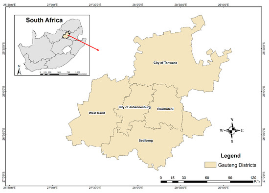 The study was conducted in Gauteng Province of South Africa, which is divided into five municipal districts (Figure 1). There are about 14.7 million people residing in Gauteng, representing around 25.4% of the national total population [20]. Even though Gauteng is a highly populated province, it is the smallest province in terms of land size with 18,178 km2 which is equivalent to 1.49% of the total area of the country. The province also houses the country’s administrative capital, Pretoria (located in the metropolitan City of Tshwane), as well as its largest city, Johannesburg.