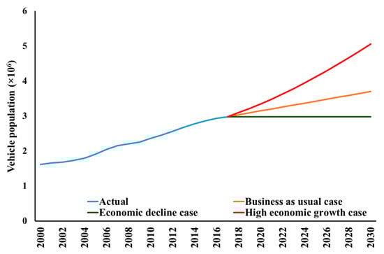 The XLSTAT ARIMA model was used to forecast the vehicle population from 2019 to 2030 (Figure 2) based on the trend recognized from the reference values from 2000 to 2017 [26]. The forecast yielded three cases, namely: