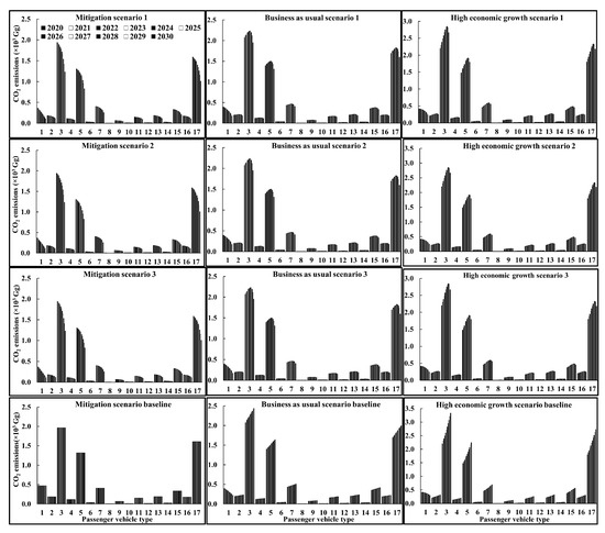 Annual CO2 emissions per vehicle class from year 2000 to 2017 for all the scenarios and different vehicle types (where 1 = mini car (petrol); 2 = small vehicle (diesel); 3 = small vehicle (petrol); 4 = lower medium vehicle (diesel); 5 = lower medium vehicle (petrol); 6 = medium vehicle (diesel); 7 = medium vehicle (petrol); 8 = upper medium vehicle (diesel); 9 = upper medium vehicle (petrol); 10 = sport vehicle (diesel); 11 = sport vehicle (petrol); 12 = offroad vehicle (diesel); 13 = offroad vehicle (petrol); 14 = MPV (diesel); 15 = MPV (petrol); 16 = SUV (diesel); 17 = SUV (petrol)).