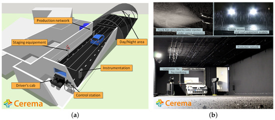 Cerema’s Adverse Weather platform [46]. (a) Overall structure. (b) Instruments and nozzles.