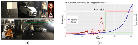 Use case of the Cerema’s Adverse Weather platform for the qualification of a Time of Flight Light Detection And Ranging (ToF LiDAR) [47]. (a) Top: used targets (three calibrated boards, vehicle, a dummy model and two traffic signs). Bottom: Velodyne UltraPuck on the table and an example scenario. (b) Average range measures (LiDAR detection) with Meteorological Optical Range (MOR) for randomly selected individual lasers of the board B target, at 15 m distance. Disappear visibility is marked as the crossings of green line.