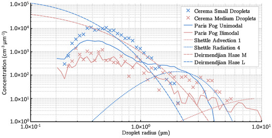 - Mallow, J.V. Empirical fog droplet size distribution functions with finite limits. J. Atmos. Sci. 1975, 32, 440–443. [Google Scholar] [CrossRef][Green Version]