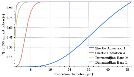It should be noted before going any further that the Particle Size Analyser (PSA) we are using in this study (PALAS WELAS 2100) has a range of 0.3–17 m. This range is not sufficient to address all types of fogs [6,51,52]. We show in Figure 4 the extinction coefficient at 550 nm calculated by Mie theory with 4 models of natural fog DSDs mentioned in Figure 3 (Shettle Advection 1, Shettle Radiation 4, Deirmendjian Haze M and Deirmendjian Haze L). More precisely we consider a truncation diameter D represented on the x-axis for each DSD and then we calculate the corresponding extinction ratio as the extinction for a DSD truncated at D m over the extinction for a DSD truncated at 50 m. The truncation diameter D therefore makes it possible to assess the impact of the PSA measurement range on the extinction estimation. The upper limit value of 50 m is chosen as the limit of classical PSAs like Fog Monitor or CDP [6,51,52]. We can observe in Figure 4 that a DSD obtained by a truncation diameter of 17 m (corresponding to the PALAS WELAS 2100 sensor) explained the whole extinction except for the Shettle advection model (less than 10 % of the extinction is explained by the PALAS WELAS 2100 sensor in this case), which is not in the scope of radiation continental fogs produced in the platform and addressed in this paper. These figures are consistent with findings in the literature [6,51,52]. This observation remains true, even taking into account the fact that the PALAS WELAS 2100 sensor would have difficulty detecting drops above 8 m [6,51]. Even in that case, more than 82% of the extinction is still explained for all radiation models (see Figure 4), keeping apart Shettle’s advection model. Our study is therefore limited to radiation fogs or haze-like fogs. Advection fogs will be investigated later on by using other sensors having a measuring range extended to larger droplets up to 40 m.