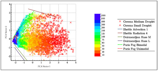 Figure 8 shows the projected data set for the first two PCA vectors. The dispersion of the data is then visually much clearer. In Figure 8, the literature models and the Paris Fog data are also projected onto the two PCA vectors. The models are then found at the edge of the data from the platform. On the other hand, the fogs collected in the Paris Fog campaign are perfectly included in the point cloud linked to the platform. This is a major result which shows that the platform fogs are well representative of natural fogs. Although data dispersion is better, a metric should be used to compare the different pairs of parameters proposed quantitatively. The method proposed in Section 3.2 was therefore applied to the database. The method is applied in two cases: