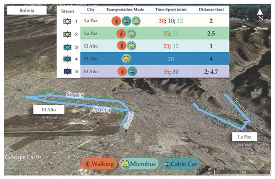 Map of La Paz and El Alto City in Bolivia with the selected commuting routes highlighted in the blue line. Time spent and distance traversed per mode of travel in each street segment is enumerated for walking, cable car, and microbus rides, respectively.