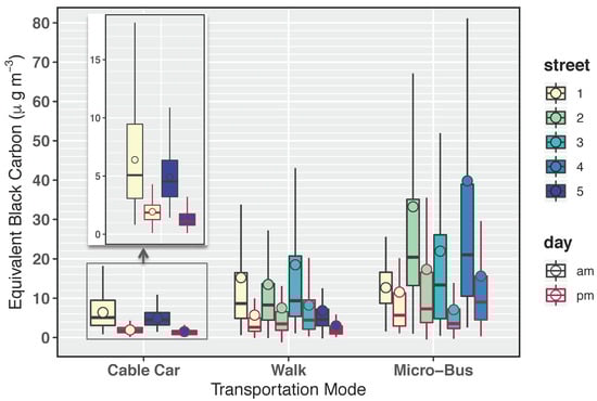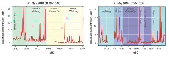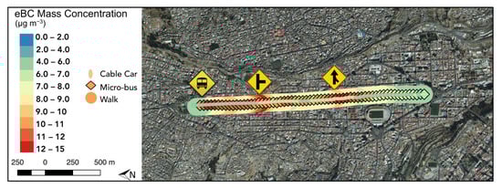 Exposure concentration of eBC was measured using two sets of portable measurement systems equipped with micro-aethalometers (model MA200, AethLabs, San Francisco, CA, USA), a GPS module (model NL-8004U, Navilock, Berlin, Germany), and a data logging device (model Odroid C1+, Hardkernel, GyeongGi, Korea), all placed in a portable backpack. A detailed description of the instrumentation can be found in Madueño et al. []. The working principle of an aethalometer is based on measuring the optical attenuation increment, when the light is passed through a particle laden filter. Equivalent black carbon mass concentration is then calculated using the known optical absorbance per unit mass of BC material. Since the MA200 is a multi-wavelength instrument, the measurements at 880 nm were interpreted as the concentration of eBC. The instrument flows (150 mL/min) were calibrated before, during, and after the measurement campaign. Both micro-aethalometers were inter-compared under real-world conditions and showed a good agreement (R2 = 0.99, Madueño et al. []. The backpacks with measurement instruments were carried in front of the body at breathing height while commuting. All sampling sessions were conducted on non-rainy days to avoid misrepresentation of typical urban air pollution conditions due to potential pollution washout []. The measurement sessions were made during morning peak traffic hour (08:00–11:00 LT, local time) and afternoon off-peak traffic hour (13:00–15:00 LT), covering weekdays and weekends. To avoid biases in sampling, measurement sessions, e.g., morning peak traffic hour, started and ended in the same city, randomly choosing the starting point and taking any mode of transportation available at the street segment. Measurements were performed over 28 days, totaling to 345 single trips, of which 179 trips were on foot (walking), 104 trips were on the microbus, and 62 trips were riding inside the cable car. After initial data screening (e.g., excluding waiting periods) a total of 129 h and 16 min of commuting were used in data analysis.