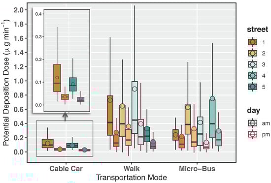 A summary of the potential RDD per trip is listed in Table 4, and normalized eBC RDD is shown in Figure 3. Although commuters using microbuses were exposed to significantly higher eBC concentrations on the same street than commuters on foot (walking) or in the cable car, the longer time spent on-road and higher inhalation rate of commuters using active modes may offset this effect (Equation (1)).