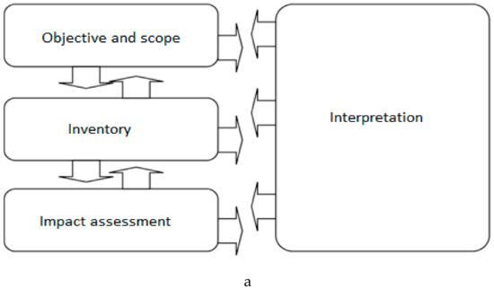 The life cycle assessment (LCA) method is a clearly validated scientific method and is even standardized at the European level [20,21]. The LCA allows one to carry out different types of comparative studies [23], for example: (i) comparison of two entire systems or part of their life cycle; (ii) comparison between different phases of the cycle life; (iii) comparison of two different versions of the same system; and (iv) comparison of a system with a reference. The method also makes it possible to quantify an environmental impact on the complete life cycle of a product or only on one stage of the cycle without necessarily making a comparison. Thus, it is a tool that can not only serve as a decision aid, but also allows targeting of the phases of the life cycle of a product, which would need to be reworked with attention paid to the environment. The normative framework of the LCA [20,21] defines four different steps to follow: (1) the definition of the objective of the study; (2) the “Life Cycle Inventory” (LCI); (3) the “Life Cycle Impact Assessment” (LCIA); and (4) the interpretation of results—all these phases are organized independently and iteratively.