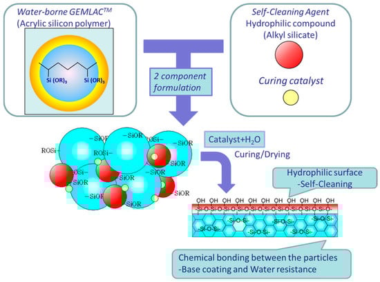 The composition and cleaning mechanism of the self-cleaning type of paint were detailed in the previous report [,]. It is composed of two liquids containing a base material made of an acrylic resin containing an alkoxysilyl group and a self-cleaning imparting agent containing an alkyl silicate, a hydrolysis, and a condensation catalyst. When the paint is used, the two liquids mix, and the paint is crosslinked and hardened by hydrolysis. A hydrophilic layer of an alkyl silicate is simultaneously formed on the paint surface, thereby exhibiting a low staining property. Figure 1 illustrates the details of the water-based self-cleaning two-component acrylic silicone paint.