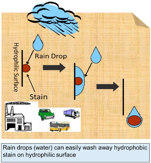 The mechanism of the self-cleaning property is explained. The hydrophilic layer formed on the surface of the paint makes it difficult for hydrophobic contaminants to adhere, and the hydrophobic stains adhered on the surface are simultaneously washed with rainwater. The details are illustrated in Figure 2.
