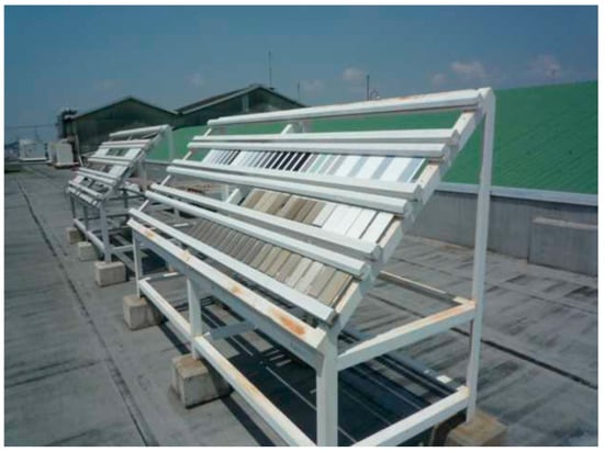 However, it has been pointed out that the solar reflectance of cool-roof coatings decreases shortly after installation [,,,,,]. Supposedly, the decrease in the solar reflectance is due to the soiling of the coating, chemical–physical modifications, and biological growth. Various studies on evaluation methods for cool-roof coatings have been carried out [,]. The reduction in reflectance has been studied in exposure tests using various materials. Changes in solar reflectance are measured every three months and are affected by the location of exposure, and it has been reported that the reflectance decreases by approximately 10% to 20% within 3 years [,]. Regarding the high-reflectance paint on the wall, the contamination status in the exposure test and the cleaning effect by precipitation have been reported []. In Japan, the main component of soil is carbon; it has been reported that, after 16 weeks of exposure of the white test piece, the reflectance in the visible light region is reduced by about 5–10% [].