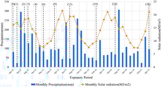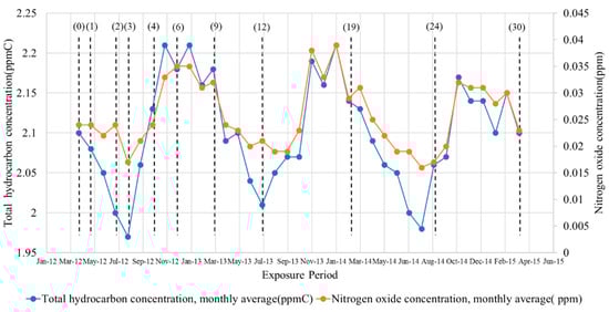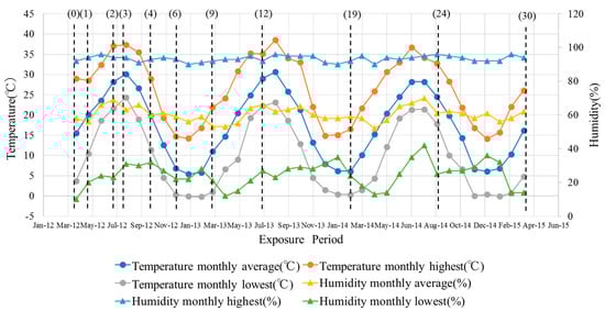 In order to enable comparison, each specimen was exposed to outdoor conditions at 45° in Settsu City (Figure 3), Osaka. The exposure period was about 3 years, starting from 26 April 2012 to 27 April 2015. During this period, substantial exposure was carried out for 30 months (36 months including the loss time for measurement). The weather information (temperature, humidity, precipitation, solar radiation) and pollutant information (total hydrocarbon concentration, nitrogen oxide concentration) during this period are shown in the information of Higashinari Ward, Osaka City, which is close to Settsu City, Osaka Prefecture in Figure 4, Figure 5 and Figure 6 (http:/taiki.kankyo.pref.osaka.jp/taikikanshi/). Information related to outdoor exposure is given in Appendix B. It tends to be hot and humid in summer but cold and dry in winter. Precipitation tends to increase as the rainy season (June) progresses to autumn. The total amount of hydrocarbons and nitrogen oxides tends to increase in the winter, because the ground surface cools in the winter and the vertical mixing becomes low, and pollutants are likely to accumulate. The total hydrocarbon content is approximately two orders of magnitude higher than the nitrogen oxide content. Osaka is located in western Japan, and is hotter and more humid than eastern Japan.