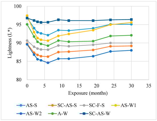 Lightness of exposure test, AS-S (conventional, acrylic silicon, solvent borne), SC-AS-S (self- cleaning, acrylic silicon, solvent borne), SC-F-S (self-cleaning, fluorine based, solvent borne), AS-W1 (conventional, acrylic silicon, water borne), AS-W2 (conventional, acrylic silicon, water borne, higher hardness), A-W (conventional, acrylic, water borne), SC-AS-W (self-cleaning, acrylic silicon, water borne).