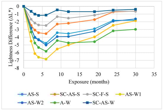 Changes in lightness (L*) and difference in lightness (ΔL*) (30 months) are shown in Figure 7 and Figure 8. The initial value of the lightness (L*) varies depending on the paint type, but the SC-AS-S, SC-F-S, and SC-AS-W self-cleaning-type paint exhibit a smaller fluctuation in lightness than conventional paint. The self-cleaning-type paint showed good results even in the difference in lightness. It is considered that the hydrophilic layer on the surface of the self-cleaning-type paint causes less adherence of pollutants; the adhered pollutants are washed by rainwater. In addition, as shown in Figure 8, SC-F-S, which is a solvent-based self-cleaning-type fluoropolymer, exhibits smaller difference in lightness than SC-AS-S, which is a self-cleaning acrylic silicon-based polymer. It is considered that the adhesion of pollutants due to the oil-repellent fluoropolymer was suppressed and the effect of cleaning by the self-cleaning type. In addition, in the water system, the conventional acrylic silicon-based AS-W2, which has a high hardness, has a smaller difference in lightness than the conventional acrylic silicon-based AS-W1. It is conceivable that, due to the higher hardness, the adherence of contaminants was reduced. In addition, there is a large difference in lightness between the conventional and general-purpose acrylic A-W, and the difference in lightness is the largest at 30 months, and the acrylic polymer is inferior in weather resistance to acrylic silicon. It is considered that the effect is caused by the decrease in gloss and the adhesion of dirt.