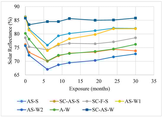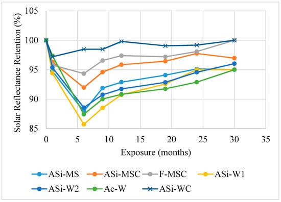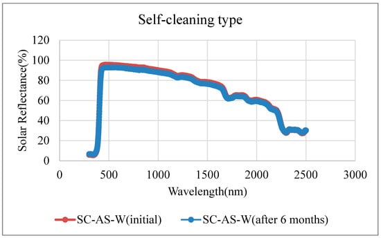 The solar reflectance and solar reflectance retention of the exposure test (30 months) was illustrated in Figure 9 and Figure 10. There was a small decrease in the reflectance of the self-cleaning-type coatings of SC-AS-S, SC-F-S, and SC-AS-W. The retention of the reflectance was also high for the self-cleaning-type coating. The reflectance retention was reduced by approximately 10–15% for conventional coatings and 5–10% for self-cleaning coatings. Furthermore, as shown in Figure 10, in the same manner as the lightness difference in the reflectance retention, the SC-F-S of the fluoropolymer is higher than the SC-AS-S of the acrylic silicone type. AS-W2 has higher hardness than AS-W1 and has higher reflectance retention than AS-W1. A-W is a general-purpose acrylic, which has a lower reflectance retention for a long period.