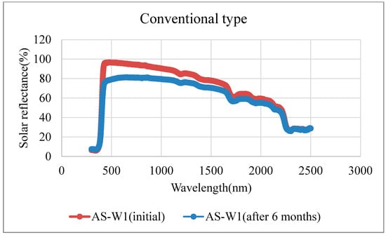 The reflection spectrum, which is the basic data of Figure 9, is shown in Figure 11 and Figure 12 as a representative sample. The self-cleaning-type SC-AS-W hardly changed, even after 6 months of exposure, whereas the conventional-type AS-W1 showed a decrease in reflectance in the visible to the near-infrared wavelength region.