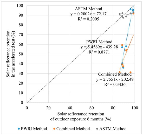 Furthermore, as described above, the PWRI method exhibited a tendency that the reflectance retention in the self-cleaning-type paint was high, and the difference between the samples could be detected. Figure 13 and Figure 14 indicate that the coefficient of determination (R2) of the approximate straight line was higher than that of the combined method and ASTM method in the relationship between the retention rate in the outdoor exposure test and the accelerated aging test. This is because (1) the hydrophilization of the paint surface in self-cleaning-type paint by pretreatment occurs at high humidity according to the Japanese meteorological environment, (2) in accordance with information on pollutants in the exposed environment of Japan, it is considered that carbon black is used at a high concentration as a pollutant, and (3) cleaning and removal with water was performed after spraying the pollutant, according to the cleaning mechanism of the self-cleaning-type paint.