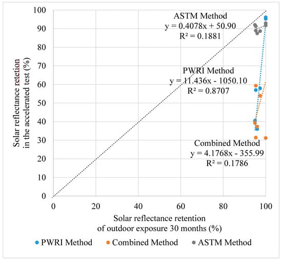 Correlation between the accelerated test and outdoor exposure test (6 months; solar reflectance retention).