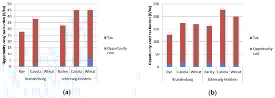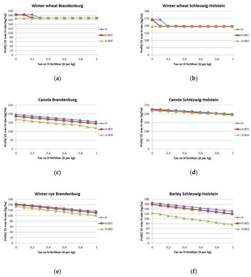 Farmers’ attitude to risk may have an impact on N fertilizer use [,]. A risk-averse agent tends to fertilize less than a risk-neutral agent, considering the uncertainties attached to N fertilization. Thus, for a risk-averse decision maker, a fertilizer tax could result in a different level of reduction in fertilizer use than a risk-neutral decision maker. Consequently, different opportunity costs could occur due to differences in N tax-related adjusted N use. Finger reported that risk-averse farmers face lower abatement costs to realize a reduced level of fertilizer use and the effect of an N tax is slightly higher for risk-averse farmers than for risk-neutral farmers with maize production in Switzerland []. However, it is not yet clear how farmers would respond to an N tax in Germany and how this would impact the comparative advantage of different crops.