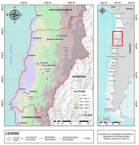 The study area is in the Atacama region, ranging between 25°17′ and 29°11′ S and 68°17′ W towards the Pacific Ocean, with an area of approximately 75,652 km2 (Figure 1) [44].