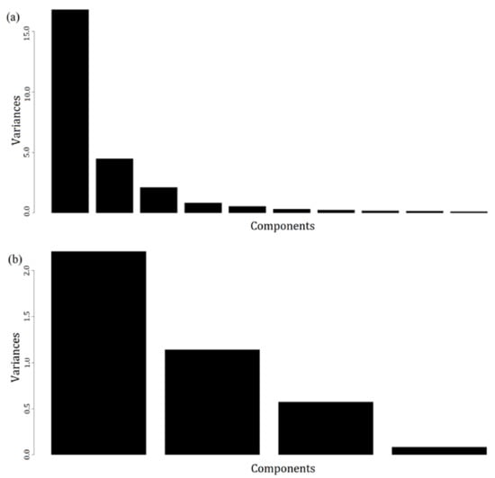 The principal components were selected according to the following criteria: (1) components that express a higher percentage of the total variance; (2) establishing a threshold collected by these components in which the variance should be between 70 and 90% [62]; (3) applying the Kaiser rule regarding the conservation of components with eigenvalues greater than the unit [63]; and (4) building a scree plot that shows variance versus component number, which dismisses the factors below the graph inflexion point [64,65].