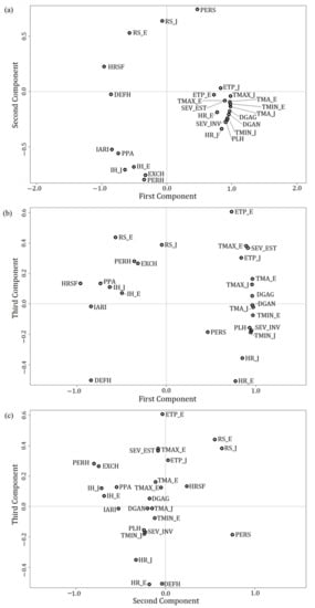 The selected climate and topographic PCs were rotated, because the third climatic and topographic components showed low loadings with all the variables, while the climate variables, i.e., ETP_E and IH_J, were characterized by a loading value greater than 0.6, with more than one component (see Figure 3a–c and Figure 4a–c).