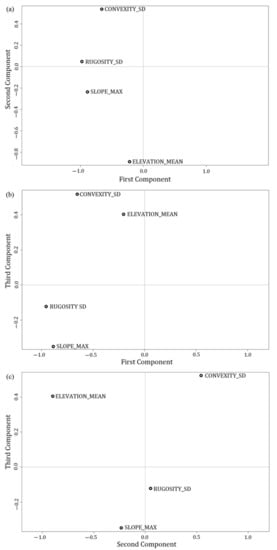 Correlations diagram between components and topographic variables of (a) components 1 and 2; (b) components 1 and 3; and (c) components 2 and 3.