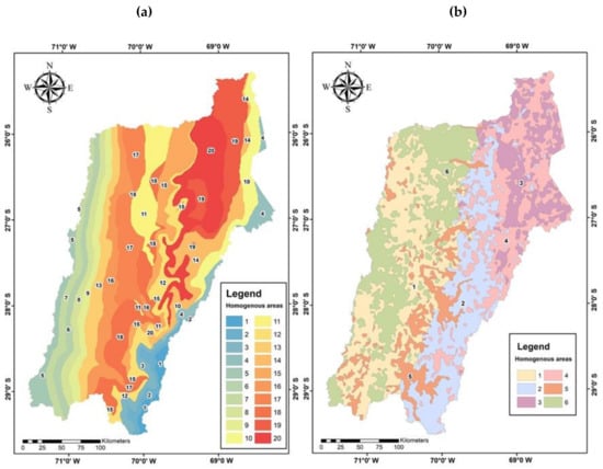 Zoning cartography for (a) climate, using 20 clusters, and (b) topography, using six clusters, for the Atacama region, obtained through principal component analysis (PCA) and cluster analysis (CA).