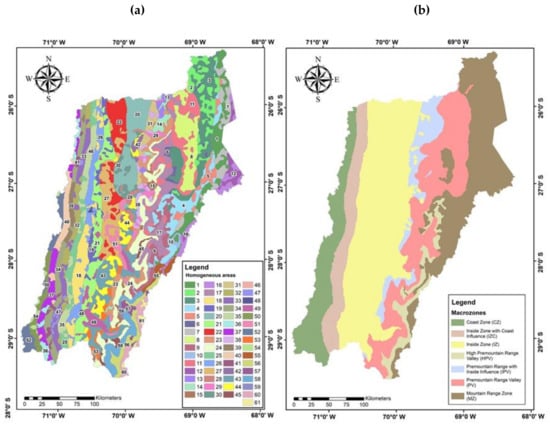 The surface of every homogeneous area was different in each case. Caroca et al. (2015) [10] defined larger representative areas than in this study, except for areas 28 (49 in our study) and 24 (51 in this study), whose extent was reduced by 52.3 and 410.3 km2, respectively. Area 27 (25 in this study) exhibited a greater size may, which was 1583.4 km2 more in their study. This discrepancy could result from using topographic variables that aim to characterize, in detail, the surface, reducing representation and defining areas that are more spatially discontinuous. In addition, Caroca et al. (2015) [10] used the climatic layers from the Atlas Agroclimático de Chile [38]. This was performed to define the agroclimatic districts, which is different from this study, where the topoclimatic zoning was developed to define representative areas.