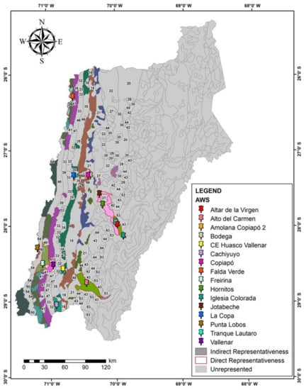 Representative area estimation considered the regional topoclimatic delimitations and geographic coordinates of 16 AWSs, distributed throughout the Atacama region (Table 2). The representative area was estimated by considering only the AWSs. In comparison with the conventional meteorological stations, these presented both accurate locations and security in terms of data reading [76], which is of significant relevance to a local study. The representative areas were identified as: (1) zones with direct representativeness (homogeneous areas that contain one or more AWSs that compile meteorological information at its location); (2) areas with indirect representativeness (meteorological information was not compiled by the AWSs, but can be standardized using direct-representation area information, because both have the same climatologies); and (3) areas without representation (corresponding to zones without an AWS and with different homogeneous areas than those that are represented), which can be potentially considered to improve the regional AWS coverage.