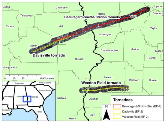An early-season severe weather outbreak occurred across the southeastern United States on 3 March 2019. A total of 40 tornadoes were reported across the region, including an EF-4 that killed 23 people near the community of Beauregard, Alabama []. An EF-3 tornado hit Leon County, Florida, just outside of Tallahassee, and seven other EF-2 tornadoes occurred in Alabama, Georgia, and South Carolina. In this study, three tornadoes that occurred on 3 March 2019 were used as case studies. The first tornado of the three devastated Beauregard and Smiths Station, Alabama, at EF-4 intensity before moving over the Chattahoochee River and continuing into Georgia, causing substantial damage in the town of Talbotton. The second tornado was an EF-2 that hit the rural community of Davisville, Alabama, in Macon County, continuing into Lee County and dissipating five miles northwest of Crawford, Alabama. The third tornado included in this study touched down near the Weedon Field airport just north of Eufala, Alabama, crossing the Walter F. George Reservoir into Georgia and affecting mostly rural areas of Quitman, Stewart, and Webster counties. A map of the study area is shown in Figure 1, and further information on these three tornadoes can be found in Table 1.