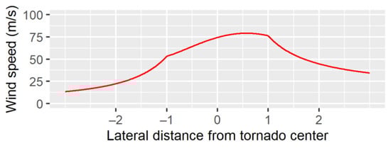 in which is the maximum tangential wind velocity in the vortex, is the radius from vortex center at which occurs, is the maximum radial wind velocity towards the center of the vortex, is the translational velocity of the tornado vortex, is the distance from tornado center measured on a plane oriented perpendicular to its translational vector, and is the approximate maximum ground-relative wind speed at distance . Equation (2) is used when < , and Equation (3) is used when > . For the purpose of this example, is set to 50 m per second (m/s), to 40 m/s, to 15 m/s, and is arbitrarily set to a unitless value of 1.0 in Figure 2, which compares reasonably well to Figure 6 in Karstens et al. (2013) [] (p. 1055).