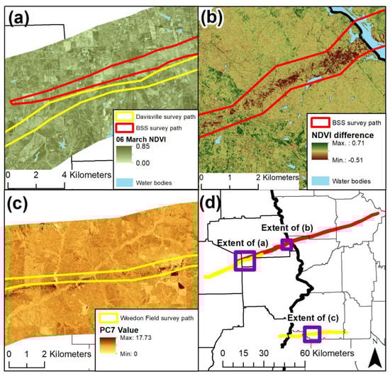 Close-up of remotely sensed damage signatures using three different metrics: (a) Post-event NDVI measured on 6 March, (b) NDVI difference, and (c) PC7. (d) Shows the extent of (a–c) within the tornado paths.