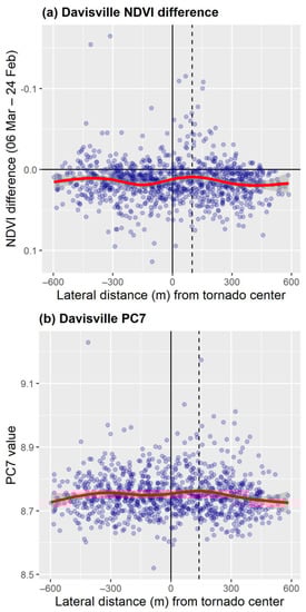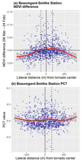 Values of pixels containing randomly placed points within the Beauregard–Smiths Station tornado path, plotted by distance from tornado center: (a) NDVI difference between 6 March and 24 February, and (b) Principal Component 7. The dashed vertical line represents the lateral distance from tornado center corresponding to the relative minimum (a) and maximum (b) in the smoothing spline. The grey-shaded envelope represents the 95% confidence interval of the smoothing spline values.
