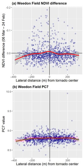 The plots for pixels in the Weedon Field tornado path are shown in Figure 6. The smoothing splines in Figure 6 are relatively flat across the width of the Weedon Field tornado path. Once again, these splines have six degrees of freedom for consistency with Figure 4 and Figure 5, but no spline from these data resembled the shape of the curve in Figure 2, even when the degrees of freedom were adjusted. A weak minimum in NDVI-difference values is evident near the center of the tornado path in Figure 6a, as are marginal increases in NDVI difference and decreases in PC7 (Figure 6b) at distances of |x| > 200 m. However, as in Figure 5, no notable variations in damage in Figure 6 are comparable to the wind field in Figure 2.