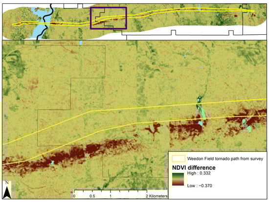 Short-term meteorological events such as severe thunderstorms and tornadoes can leave lasting effects on the natural landscape. Wind, hail, and tornado damage to forests and agricultural regions can be severe enough to identify with both ground level observations [,,,,] and satellite imagery [,]. Aerial imagery of tornado damage has been used since the mid-20th century and allows for a “birds-eye” view to identify patterns that may not be discernible at ground-level, or would otherwise be unidentified [,]. This approach can be particularly useful in rural or remote regions that are difficult to survey after the event because they are inaccessible at ground level [,,,]. Additionally, tornado intensity is difficult to infer in areas where damage indicators are lacking []. Recent advances in moderate- and high-resolution multispectral imagery have allowed for further study of vegetation damage by tornadoes [], as well as tornado characteristics that may not be apparent at the ground level, including the extent of tornado path and effects of local topography [,,]. These techniques are most effective when using imagery with a high spatial resolution in regions of strong damage and homogenous land cover [,]. Normalized Difference Vegetation Index (NDVI, used as a proxy for vegetation health) differences and principal components techniques can be used to discern damage as weak as (E)F-1 [,,] on the Enhanced Fujita (EF) scale, with more pronounced decreases in NDVI corresponding to greater damage in stronger tornadoes [,]. NDVI difference calculated from an image obtained before the tornado event and an image obtained after the event, as is performed in this study, is an effective tool in damage identification []. However, debris removal and other non-meteorological processes occurring in the weeks after the event can also affect NDVI in ways that are not a direct function of damage severity []. Additionally, the seasonal fluctuation of NDVI affects its utility in monitoring longer-term recovery []. Photosynthetic activity may be stunted or stopped completely in vegetation damaged by the tornado, and forest damage has been observed to persist for months, relative to nearby undamaged areas []. These factors must be taken into account when selecting imagery for differencing-based methods.