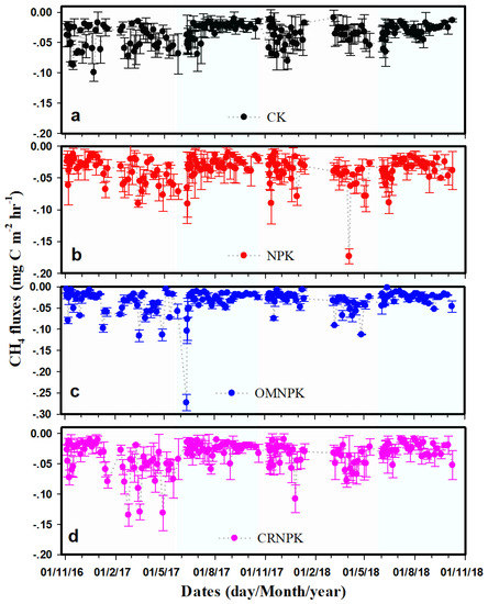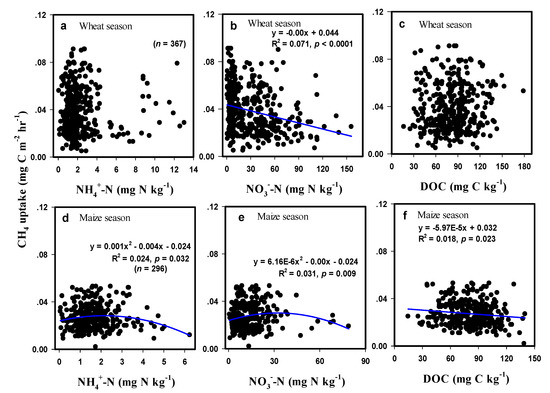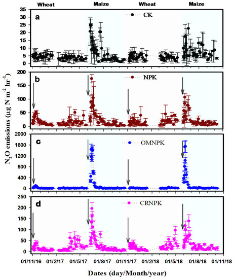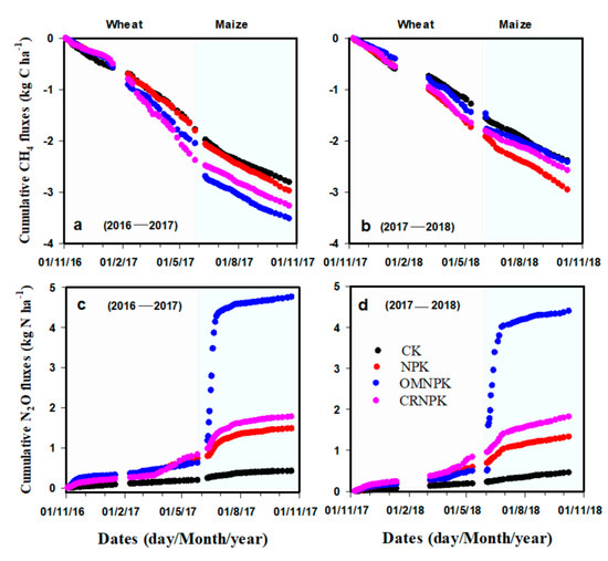 - Liu, C.; Wang, K.; Zheng, X. Responses of N2O and CH4 fluxes to fertilizer nitrogen addition rates in an irrigated wheat-maize cropping system in northern China. Biogeosciences 2012, 9, 839–850. [Google Scholar] [CrossRef]