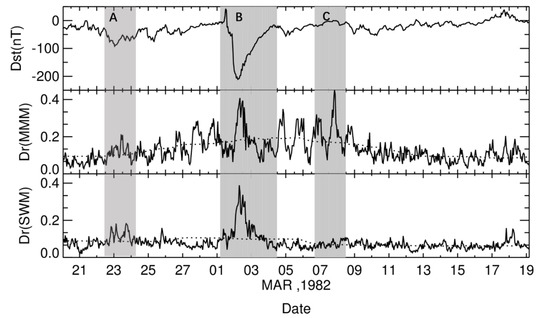 In this study, for a given ionospheric station, denotes the time variation of foF2. The SWM has been shown to be more effective than the monthly median method (MMM) in the identification of ionospheric perturbations related to geomagnetic activity [19,21,22]. As shown in Figure 1, a strong geomagnetic storm occurred in March 1982. The ionospheric index Dr is defined as the mean of the absolute perturbation values of the global RfoF2 (relative value of the foF2) based on the SWM or MMM at the same time; it represents the overall level of global ionospheric perturbations. It suggests that the Dr (SWM) index is very effective in responding to global ionospheric perturbations before and after a geomagnetic storm. Regards the Dr (MMM) index, its response to geomagnetic storms can also be observed (shaded periods A and B in Figure 1), but many more strong and significant perturbations appear in shaded period C. This disturbance shows significant diurnal variation, which can be observed during the period ranging from 27 February to 9 March. Those disturbances should be the residuals of the diurnal variation, which is caused by the drawback of MMM. The dotted lines in Figure 1 represent the smoothed Dr. Since MMM is one kind of low-pass filtering method and as it is hard to filter the diurnal variation and 27-day quasi-periodicity, the Dr (MMM) values significantly fluctuate around the smoothed Dr (MMM) over a 27-day cycle.