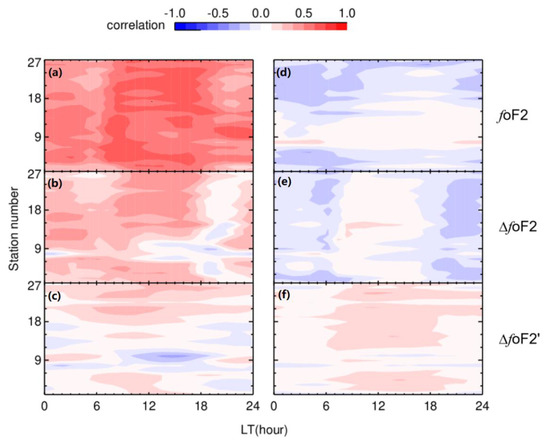 Figure 2 presents the relationships between the ionospheric foF2 and the solar activity index F10.7 (or the geomagnetic activity Ap index) at different LT (local time). The ionospheric foF2 observations were obtained from 27 global ionosondes (station numbers are indicated along the y axis) over a period of more than 30 years. The correlation coefficient between foF2 and F10.7 (Ap) is shown in Figure 2a,d. As the main driver, the effect of solar activity dominates the trend of ionospheric foF2; the correlation between the original foF2 values and the F10.7 index is very high, which are up to 0.7 in most ionospheric stations, especially during the daytime (Figure 2a). Due to the original foF2 and Ap including the data in the geomagnetic quiet period, which covers most of the data range, the correlation coefficients between foF2 and Ap are small. Therefore, the effects of geomagnetic activity are difficult to identify in the original observations (Figure 2d) and the correlation coefficient between foF2 and Ap does not exceed 0.1 for most stations. After processing the original data through the traditional method (Equations (2) and (3)), as shown in Figure 2b, the effect of solar activity on ∆foF2 is weakened, but the correlation coefficients between ∆foF2 and the F10.7 index are still very high (more than 0.7 for some stations). The effects of geomagnetic activity on ∆foF2 are weak (Figure 2e). This implies that the traditional method hardly extracts the geomagnetic activity effects. Using the SWM process (Equations (4) and (5)), the correlation coefficient between ΔfoF2’ and F10.7 (Ap) indices is presented in Figure 2e,f. Compared with traditional method, this suggests that the SWM can reject the effect of solar activity (the correlation coefficient is less than 0.3) and better extract the effect of geomagnetic activity from the ionosphere. The SWM may be suitable in studying the geomagnetic activity on the ionosphere. In fact, solar activity not only affects the ionosphere’s behavior, it also significantly modifies the variability in geomagnetic activity, so explorations of the effects of geomagnetic activity on the ionosphere should not completely neglect the variation of solar activity in different solar cycles.