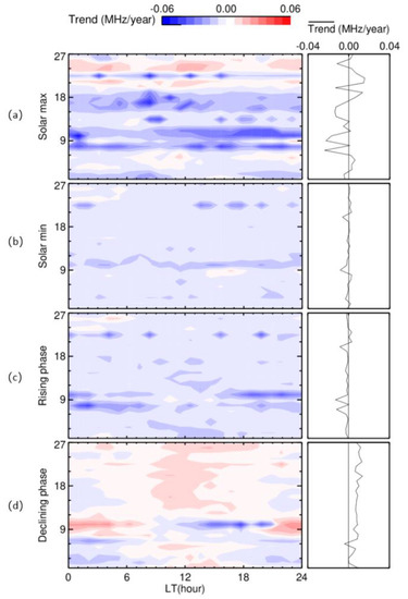 This suggests that the trends for solar and geomagnetic activities are not synchronized and that the lag between the two can offer an opportunity to understand the contribution of geomagnetic activity to ionospheric trend variations. The geomagnetic activity affects the ionosphere differently under solar maximum and minimum periods. For solar maxima, more and stronger geomagnetic activities will mean that the effects of these activities on the ionosphere are easily identifiable. Their effects on ionospheric trends vary greatly with different stations, resulting from different regional ionosphere with different responses to geomagnetic storms [1,2]. However, during solar activity minimum years, the lower level of geomagnetic activity will contribute weakly to the long-term ionospheric trend, which will consequently have a very small value. During ascending years, the geomagnetic activity is also very weak, so its effect is the same as minimum years (Figure 3c). During a declining year, solar activity will drop to a mean level, which will have a relatively weak effect on the ionosphere, but geomagnetic activity will reach its maximum level. Thus, geomagnetic activity will play a more important role than other solar cycle phases in the ionosphere. As shown in Figure 3d, most regional variations are positive, and during daytime the trend is more significant. This is similar to the trend seen in the original data (Figure 2a). This suggests that the contribution of geomagnetic activity to the ionosphere is significant and is comparable to that of solar activity when geomagnetic activity is strong.