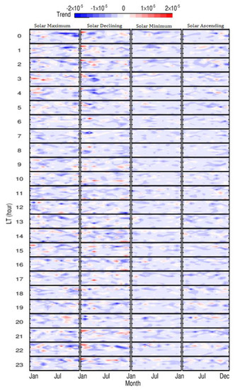 As far as we know, the response of the ionospheric F2-layer (foF2) to geomagnetic activity depends on the season and LT; thus, studying the dependence of ionospheric trends on the local time and season is necessary (as shown in Figure 4). This effect shows that the global ionosphere varies greatly with the seasonal trends at different phases of solar activity. In total, the global ionospheric trend varies hugely with different seasons, solar maxima, and declining years, but very weakly with solar minima and rising years. In general, the responses of the ionosphere to geomagnetic activity are larger around winter and smaller around summer.