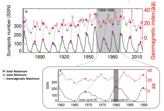 The relationship between the geomagnetic and solar activity is complex, as coronal mass ejections, high-speed streamers, and slow solar winds can affect temporal variations in geomagnetic activity over a solar cycle [28]. In fact, solar activity is an important driver of geomagnetic activity. As shown in Figure 5, the geomagnetic activity maximum always lags behind the solar activity maximum, which often appears during the declining phase of the solar activity cycle. However, the geomagnetic and solar activity minimum years occur close to each other in most solar cycles. During the solar maximum year, the annual average of the geomagnetic activity is often relatively low. Richardson et al. [28] found that this phenomenon is present from cycles 19 to 22 (hatching in Figure 5b). Such decreases in the geomagnetic activity are thought to be a manifestation of the so-called “Gnevyshev gap” [29,30,31,32], which suggests that strong solar activity modulates strong geomagnetic activity in a complicated fashion. The delay of geomagnetic activity with respect to the 11-year solar cycle has been known for many years [33]. However, as shown in Figure 5, the time scale of the delay is complex and dynamic; the delay time intervals appear to be different for different solar cycles.