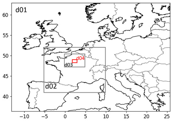 Four nested domains—from d01, the largest one, at a low resolution to d04, the finest one, at a high resolution.