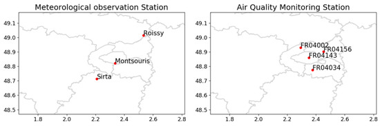 Two types of observation data are used in the present study: (i) three meteorological observation stations operated by METEO FRANCE and SIRTA were used to evaluate the simulated surface meteorological variables from the model; and (ii) the hourly surface concentrations of criteria pollutants (NO2, PM2.5, and PM10) issued from AIRPARIF, the official Paris air quality network. The location of the three meteorological observation stations (Montsouris, Roissy, Sirta) and the four air quality monitoring stations can be found in Figure 2; they are urban or sub-urban background stations. The FR04143 air quality monitoring station is located in the city center. “Roissy” is a synoptic station of the Paris international Airport; “Montsouris” is an historical meteorological station located within Paris, operating since 1869; “Sirta” is a recent station located in a suburban environment.